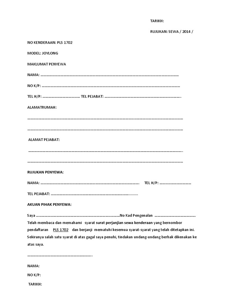 Surat Perjanjian Sewa Kereta Pdf
