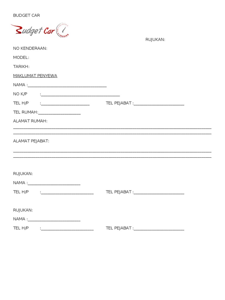 Nama penyewa Nama tuan Kenderaan No kad pengenalan penyewa Alamat penyewa Jenismodel kenderaan No. Senarai nama pekerja yang terlibat dengan tindakan sebagaimana yang dilaporkan melalui borang pk di bawah seksyen 63 akta kerja 1955 Kegagalan berbuat demikian merupakan satu kesalahan dan saman tambahan boleh diisu. KAMI berhak menuntut bayaran tambahan jika kenderaan ini lewat dikembalikan selepas tamat tempoh sewa seperti di atas pada kadar RM 1500 jam.